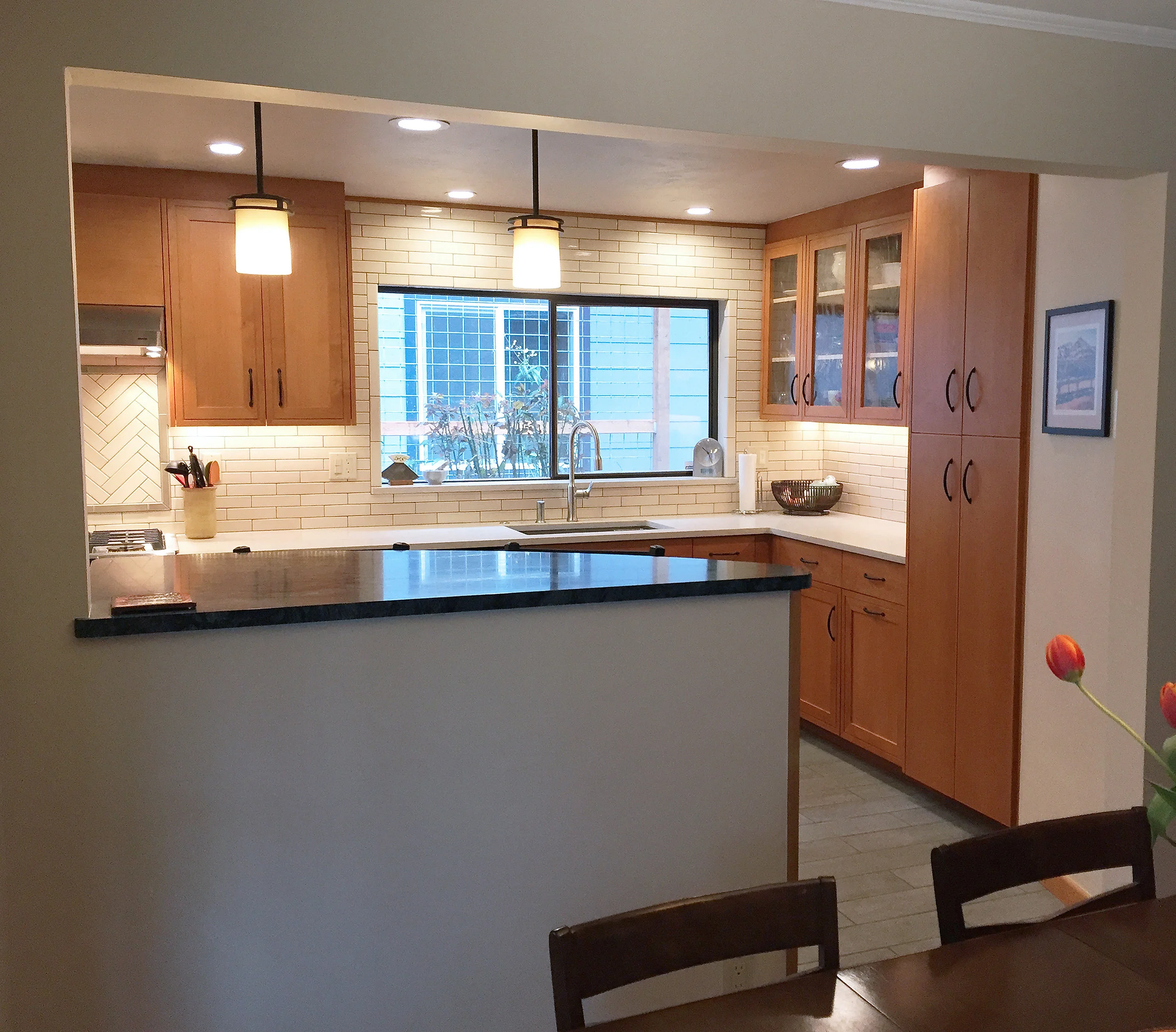 Suzan and John's home was delightful in many ways, but the kitchen was cut-off from the flow of the rest of the house, ending in an awkward hall that opened to a guest room on one side and a utility closet at the other. A bathroom was in close proximity but due to the patchwork layout felt miles away. The goal was to update the kitchen and reestablish the connection from the dining room all the way back to the guest bedroom accommodations, while making the whole space ADA accessible. The homes mixture of Mid-Century Modern and New Mexico Bungalow styles influenced the simple planes of line, color, and materials used. One key feature was the bar counter. The bar connects the kitchen and dining rooms but is also part of the entry sequence and needed to tie the potentially competing home styles together. The soap stone counter material selected picks up on the steel dining room window, and the wood casing at the opening subtly eases the eye from the front of the home through to the kitchen and beyond. An unexpected benefit of the remodel is the ability to use the guest bedroom primarily as an office most of the time, leaving the dining room and adjacent areas where work was done in the past clutter-free. The result is an elegant space that meets the needs of the clients while staying true to the unique mix of styles they love.